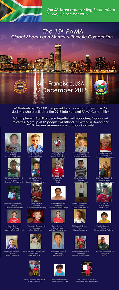 30 SA students qualified to represent South Africa at the 13th PAMA International Abacus and Mental Arithmetic Competition on 29th December in Taipei, Taiwan
